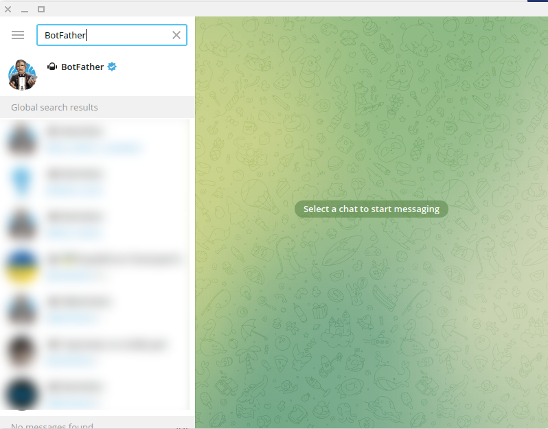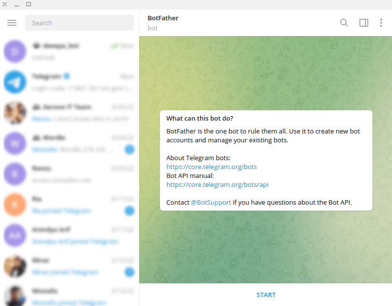 To build a Telegram bot with Einfacherbot, first, open your Telegram App. Then in the search bar of the app, search with the ‘BotFather’ keyword. Then select the verified BotFather account.