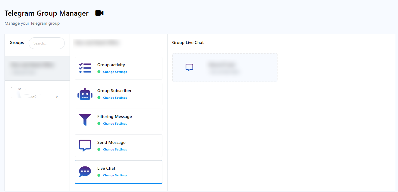 1. To initiate the process, navigate to the `Telegram Group Manager` and select a bot from the group`s Live Chat window. Click on the chosen bot to proceed.